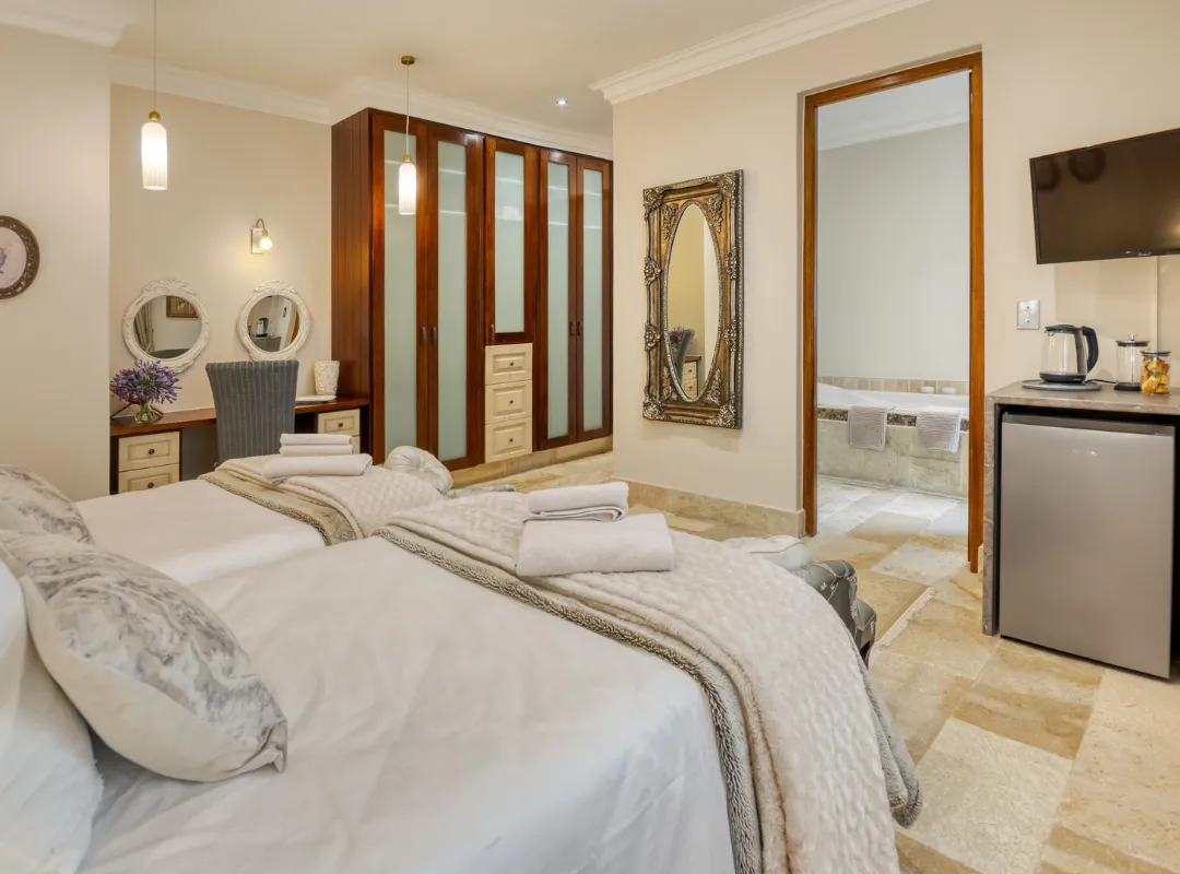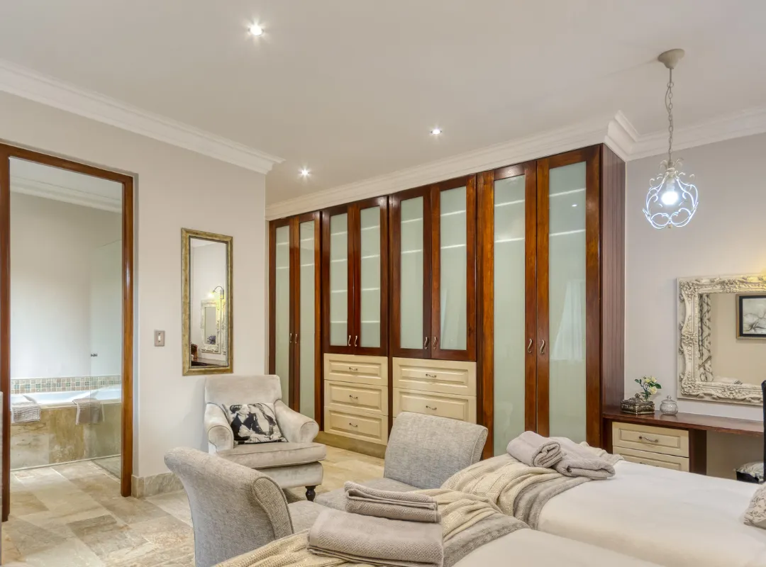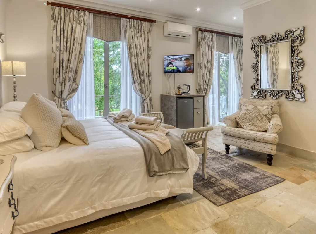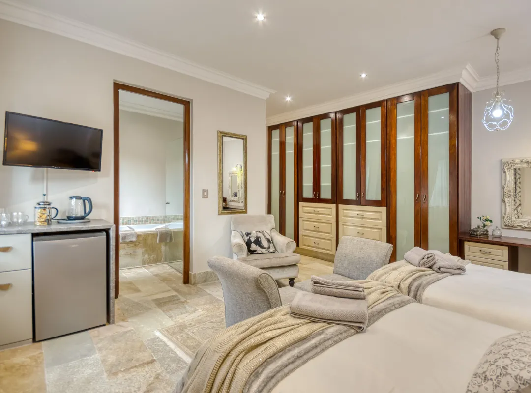 The La Lavande Suite offers an exquisite retreat where gentle grays, pristine whites, and warm creams create an atmosphere of understated luxury. This refined sanctuary captures breathtaking views of the estate’s carefully tended gardens and the historic Stellenbosch landscape beyond. The suite’s elegant design marries modern comfort with timeless style, providing a peaceful haven where guests can immerse themselves in the natural splendor of the Cape Winelands from their own sophisticated escape.